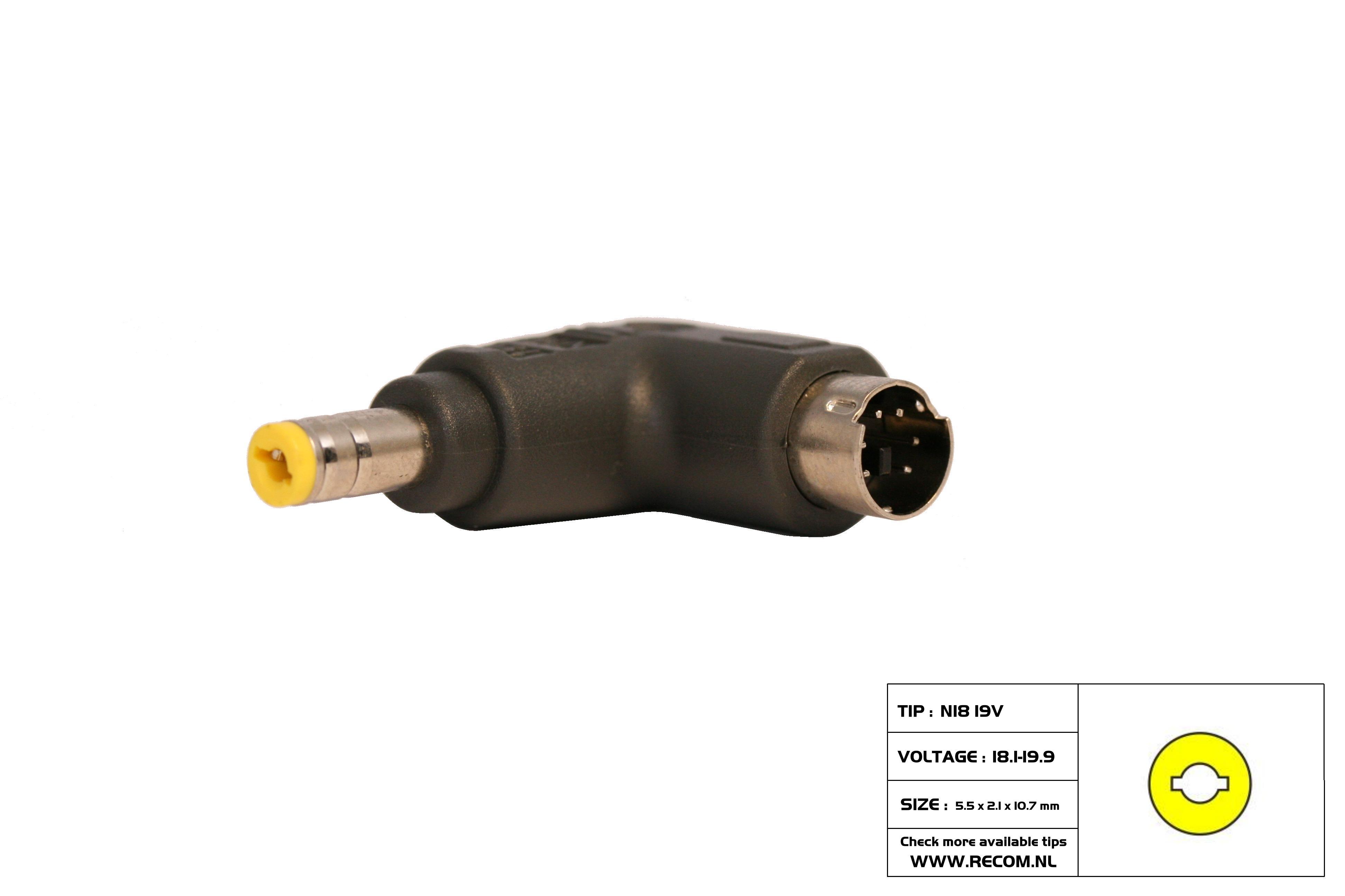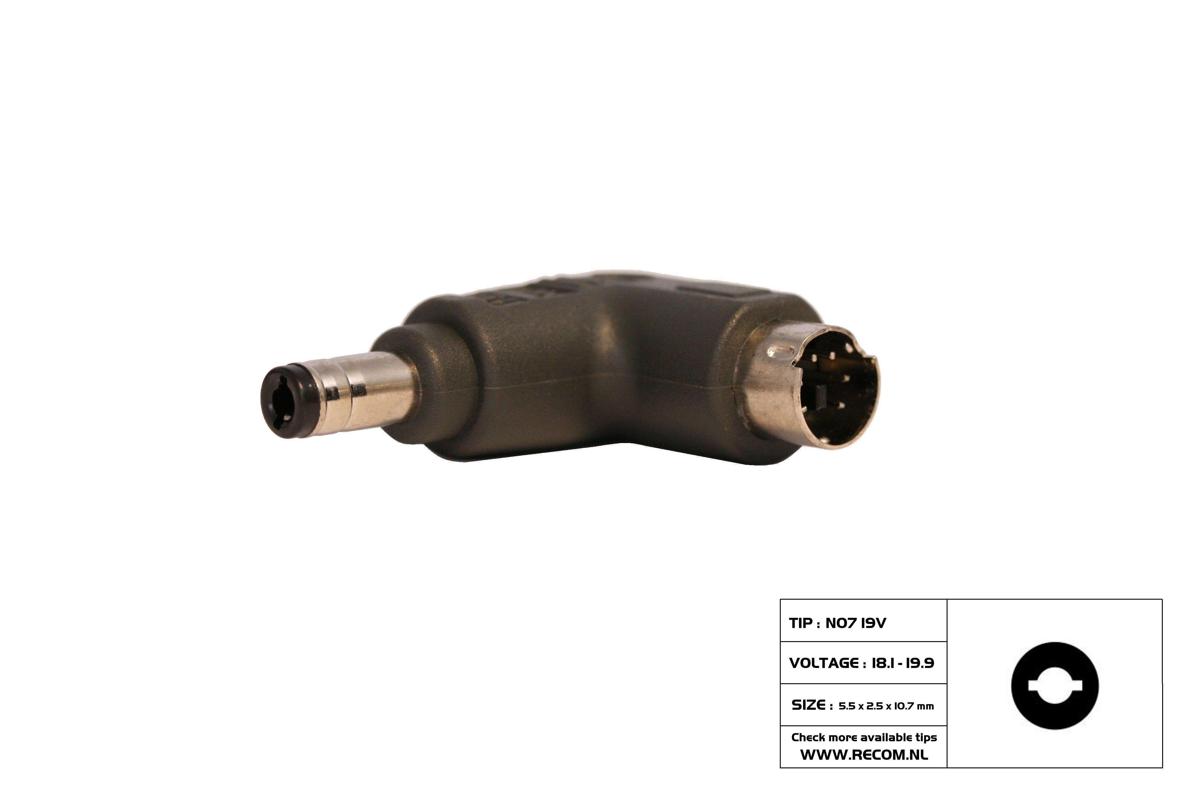 TIP N07 19volt (5.5 × 2.5 × 10.7mm) Acer: 19V 3.42A BenQ:19V 2.1A Dell:18V 1.9A , 19V 2.4A , 19V 1.58A , 19V 3.16A HP:18V 2.3A , 19V 2.4A , 19V 3.16A Compaq: 18V 1.9A , 18.5V 1.1A , 18.5V 4.9A , 19V 4.9A IBM: 19V 2.4A , 18V 1.9A , 19V 3.16A , 19V 4.2A Toshiba:18V 1.1A , 18V 1.7A , 19V 1.58A , 19V 3.42A , 19V 4.74A Gateway19V 3.16A , 19V 3.68A , 19V 4.74A NEC:19V 2.64A , 19V 3.16A Delta:19V 2.64A , 19V 3.42A Lite-On:19V 3.16A , 19V 3.42A , 19V 3.95A , 19V 4.74A Epson:19V 1.23A