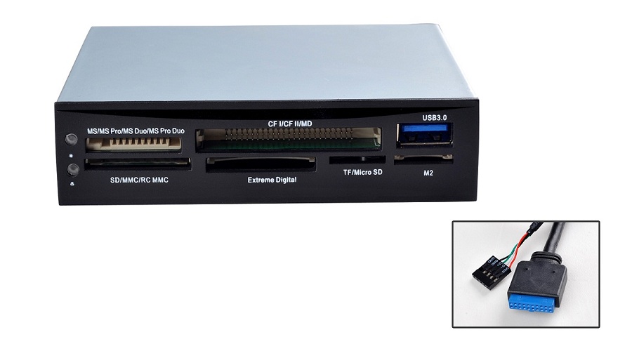 RC-DR-A4 Data Reader 3,5" internal - SDHC & SDXC 64GB compatible! High speed USB 3.0 with 20 pin blue internal connector, Plug & Play data reader. All-in-one memory reader based on 3,5" design to fit in all pc cases. Backwards compatible to USB 1.X. Additional USB connector on the front and hot swapable. Led activity indication included. Compatible with Windows 7 (x86 / x64).