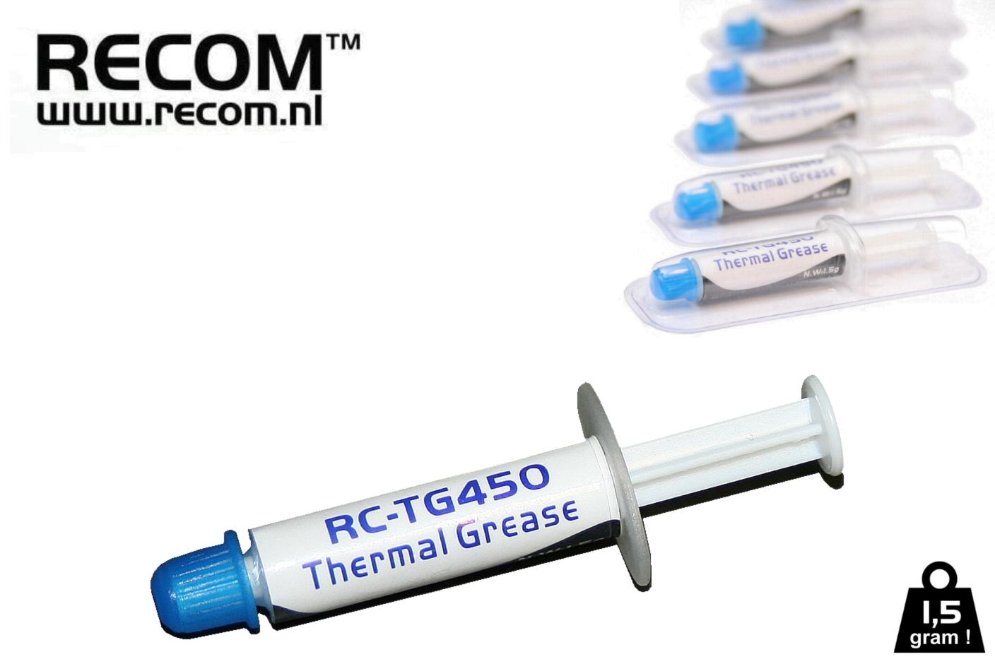 RC-TG450 TG450 Ceramic Thermal Grease The TG450 ceramic thermal compound has a white color and a volume of 1,5g. It delivers a professional heat dissipation due to it's high thermal conductivity. Packed in clear blister. Thermal Conductivity >1.729 W/m-K, Thermal Impedance <0.125 degrees- in2/W, Specific Gravity >2.3, Evaporation <0.001%, Bleed <0.05%, Dielectric Constant >5.1