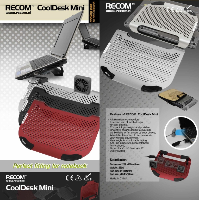 RC-CD-MINI CoolDesk Mini Recom introduces a new product in the popular CoolDesk line: CoolDesk Easy. This full aluminium 3-in-1 notebook stand, cooler & protector is the ultimate low-cost product for your portable customers. Specially designed for netbooks (up to 12") and other small notebooks! Download the flyer |